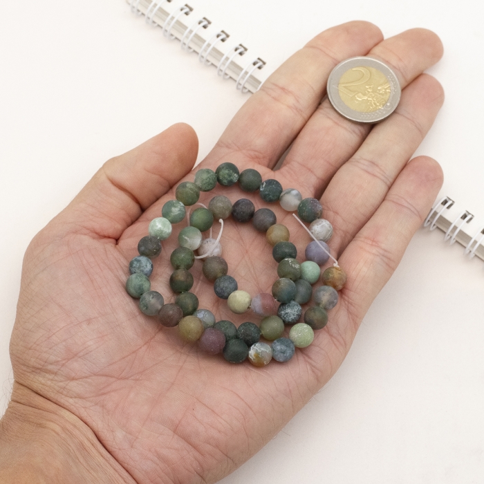 Матовые бусины из индийского агата идеально подходят для создания различных украшений, таких как браслеты, ожерелья, серьги и подвески. Благодаря своей природной текстуре и богатству оттенков, они прекрасно сочетаются с другими натуральными материалами, такими как дерево, металл и жемчуг. Эти бусины можно также использовать для декора или создания аксессуаров в этническом и бохо-стилях, добавляя изделиям гармонию и природную красоту.атовые бусины изготовлены из натурального индийского агата и имеют круглую форму. Матовая поверхность придаёт им особую утончённость и мягкость на ощупь, подчёркивая природную красоту камня. Агат известен своим разнообразием природных оттенков, от тёплых зелёных и коричневых до глубоких серых и синих тонов. Неокрашенные бусины сохраняют свою естественную палитру, делая их идеальным материалом для создания уникальных украшений и аксессуаров.
