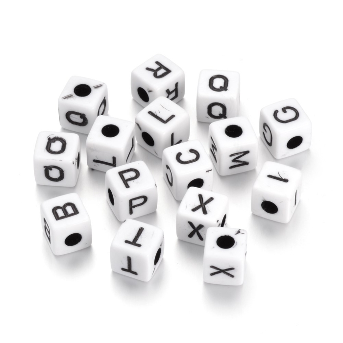 Набор кубических акриловых бусин из непрозрачного пластика с нанесенными буквами латинского алфавита. Горизонтальное отверстие позволяет легко нанизывать их на шнур или нить. Различные цвета и буквы создают множество вариантов для персональных украшений.