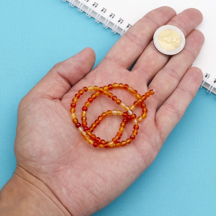 Круглые бусины изготовлены из натурального красного агата, который также известен как сердолик или карнеол. Камень славится своими насыщенными оттенками от светло-оранжевого до глубокого красновато-коричневого. Неокрашенные бусины сохраняют свою природную текстуру и цвет, что придаёт им особую красоту и уникальность. Красный агат (сердолик) считается символом жизненной энергии, страсти и гармонии, что делает его популярным материалом для создания украшений с глубоким смыслом. Карнеол известен своими энергетическими и балансирующими свойствами. Он помогает устранить психическое напряжение и стресс, способствуя ощущению гармонии и равновесия в теле и уме. Этот камень также усиливает чувства любви и верности, вселяет мужество, уверенность и решительность. Благодаря своему тёплому красновато-коричневому или оранжевому цвету, карнеол становится не только символичным, но и великолепным дополнением к любой ювелирной коллекции.