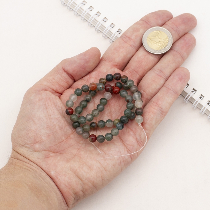 Естественные круглые бусины из африканского кровавика, известного также как гелиотроп. Камень имеет насыщенный зеленый цвет с характерными красноватыми вкраплениями, напоминающими капли крови, благодаря чему он получил свое название. Считается символом силы, энергии и защиты.