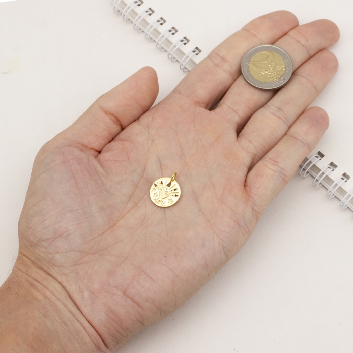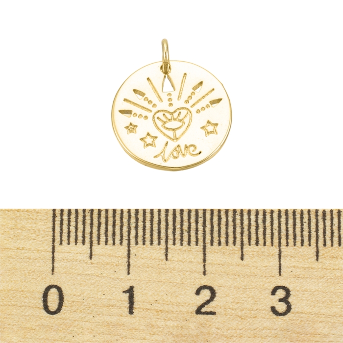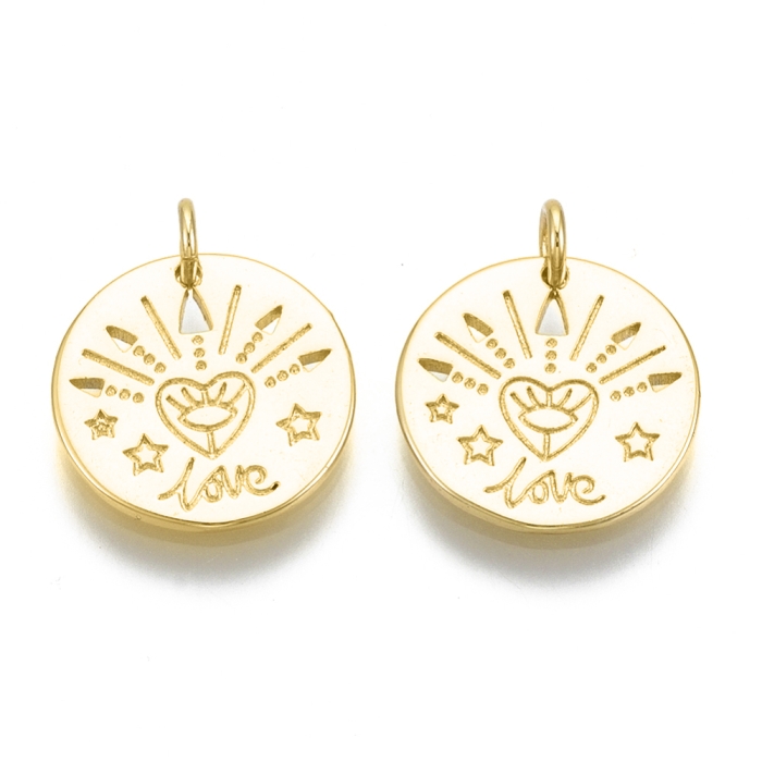 Кулон, Латунь, Плоский Круглый со словом "Love", Покрытие Золото 15К, Размер: 15х1.5мм, Отверстие 3мм, Соединительное кольцо 5х1мм, (УТ100031322)