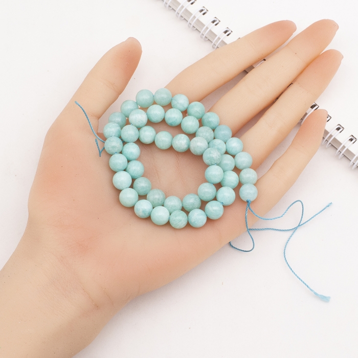 Эти бусины также идеально подходят для изготовления амулетов и талисманов благодаря ассоциации амазонита с внутренним спокойствием и защитой. В декоративных проектах они используются для украшения аксессуаров, таких как сумки и шнуры, или для создания интерьерных украшений, включая декоративные панели или подсвечники. Натуральный амазонит добавляет изделиям природную красоту, гармонию и утонченность, делая их уникальными и запоминающимися.