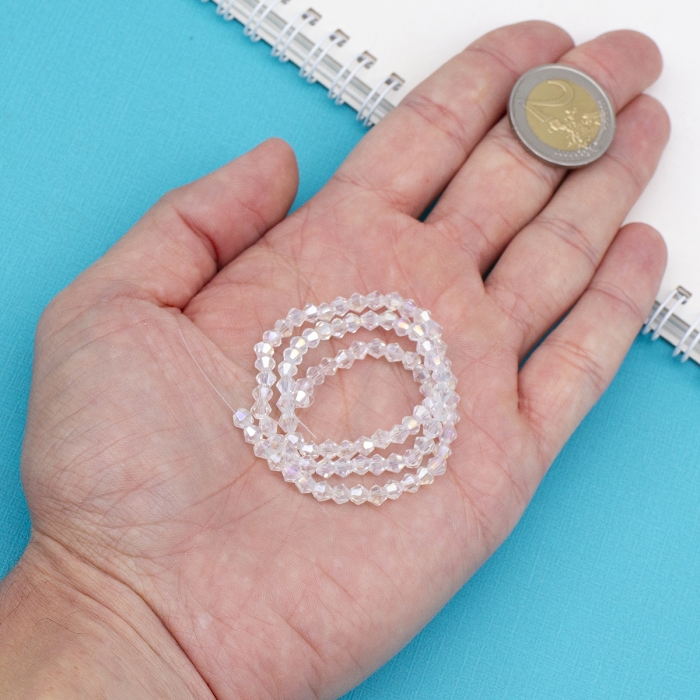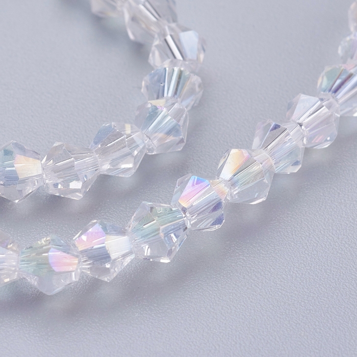 Бусины Стеклянные АВ-Цвет Граненые Биконус, Бесцветные, 4х4мм, Отверстие 1мм, около 80шт/29см/нить, 10нитей/упак, (УТ100031828)