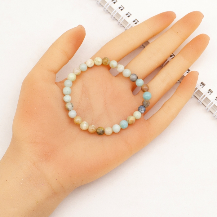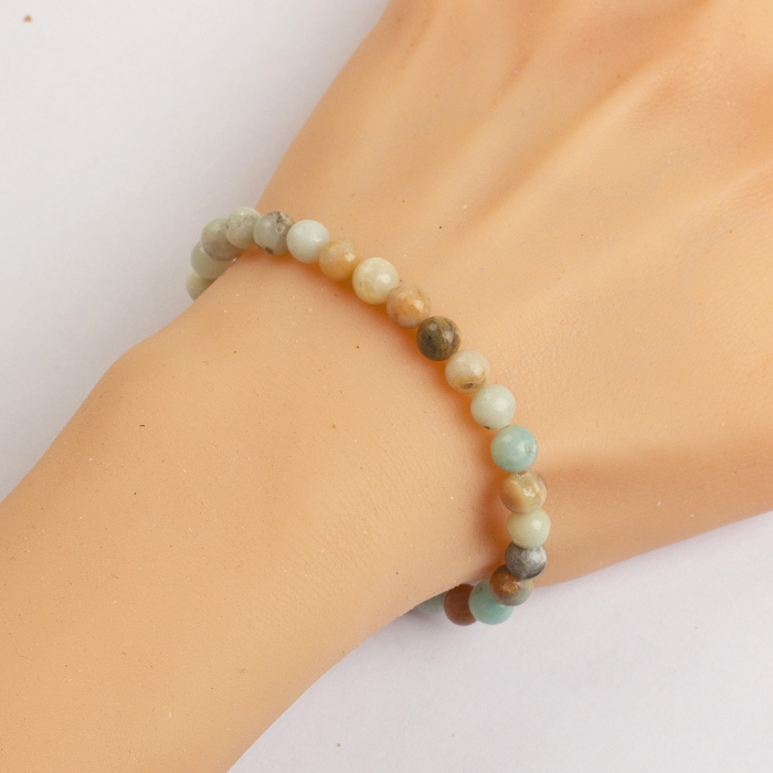 Браслет из бусин натурального амазонита выполнен с использованием идеально круглых бусин, каждая из которых обладает нежными оттенками бирюзового, голубого и зеленого цветов. Собранный на эластичной нити, браслет обеспечивает комфортное ношение и универсальность, подходя для запястий разных размеров. Амазонит известен своей природной красотой и уникальной текстурой, которая делает каждое изделие неповторимым.
