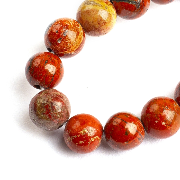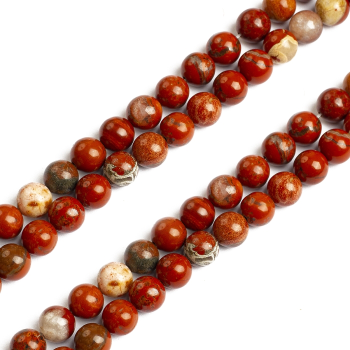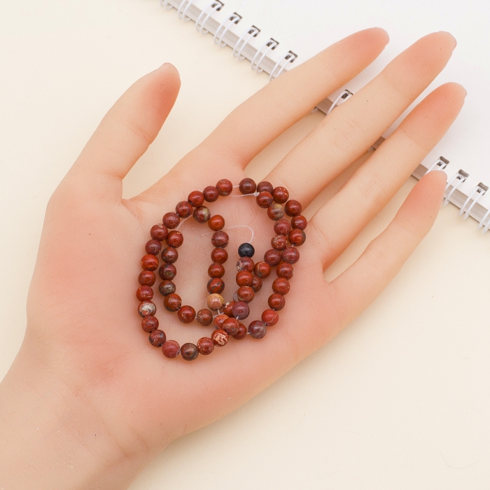 Круглые бусины из натуральной красной яшмы класса АВ — это природный материал с насыщенным тёплым оттенком терракоты. Поверхность бусин гладкая, с возможными природными включениями и уникальным рисунком каждого камня. Класс АВ означает хорошее качество обработки с допустимыми лёгкими природными неровностями, подчёркивающими натуральность.
