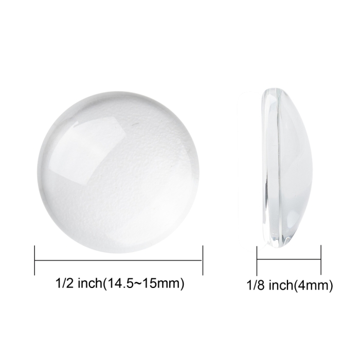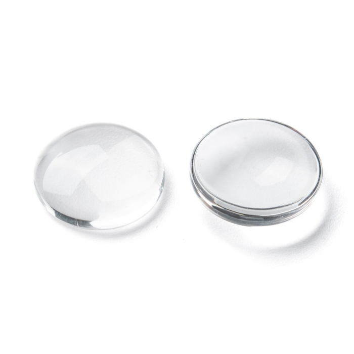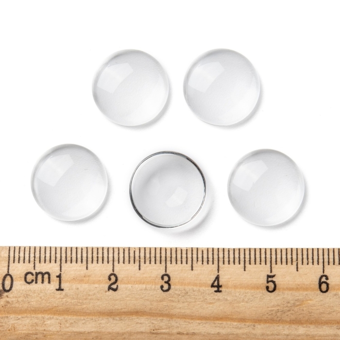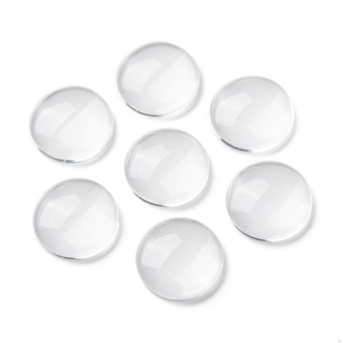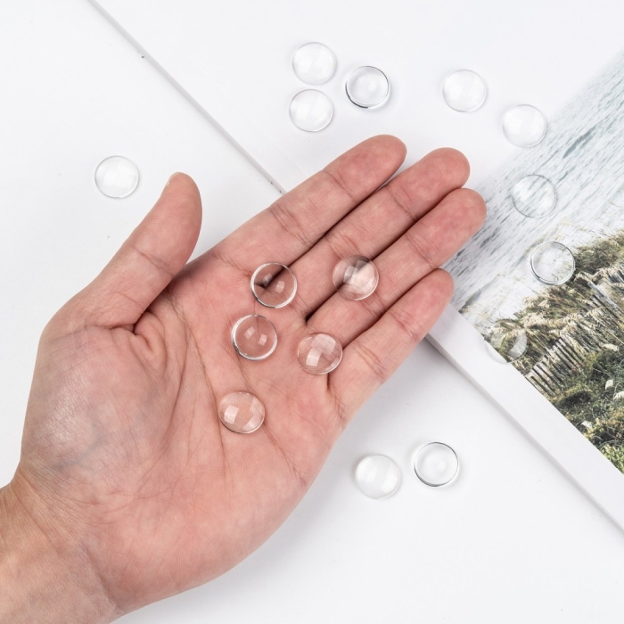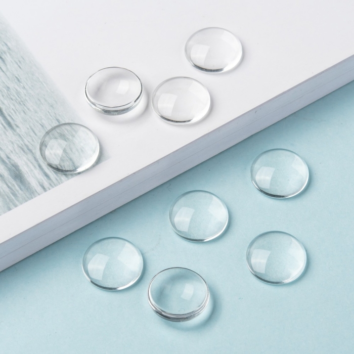 Круглые стеклянные кабошоны — это универсальные элементы для декорирования, отличающиеся гладкой поверхностью и эффектом объема. Они изготовлены из высококачественного стекла, что придаёт им прозрачность и блеск, усиливающий глубину цвета и рисунка основы, с которой они используются. Полукруглая форма придает кабошонам выпуклость, позволяя фокусировать свет и создавать визуальный эффект увеличения изображения под стеклом. Обратите внимание, что кабошоны идут без клеевой основы, поэтому для их крепления потребуется использовать подходящий клей.