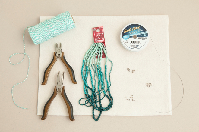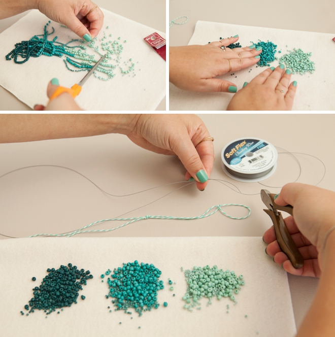 2. Вовремя бисероплетения работайте на кусочке фетра, чтобы бисер не катался по столу и не падал с него. Выложите бусины и бисер на войлок. Затем отрежьте кусок проволоки Softflex длиной минимум вдвое больше длины вашего шпагата.