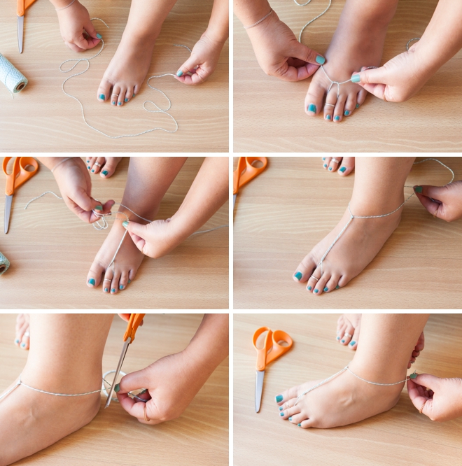 1. Каждая нога будет отличаться по размеру, даже ваши собственные ноги могут быть немного разными. Поэтому мы предлагаем простой способ измерить свои стопы с помощью шпагата. Возьмите длинный кусок шпагата, оберните его вокруг второго пальца ноги и завяжите узел на расстоянии около 1-1,5 см от основания пальца. Затем, соединив оба конца шпагата позади лодыжки, завяжите другой узел на расстоянии примерно на 1-1,5 см от лодыжки. Затем оберните концы шпагата вокруг лодыжки и обрежьте там, где они соединятся. Снимите веревку с ноги, не развязывая узелков. Теперь у вас есть идеальная мерка.
