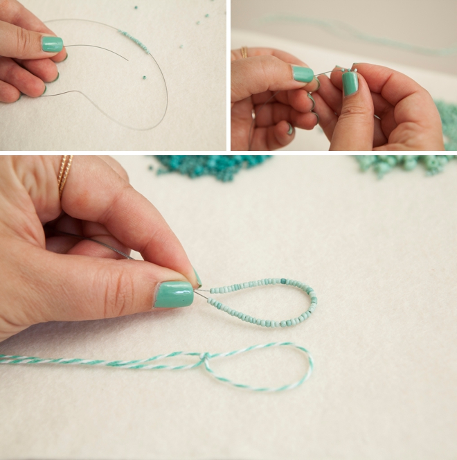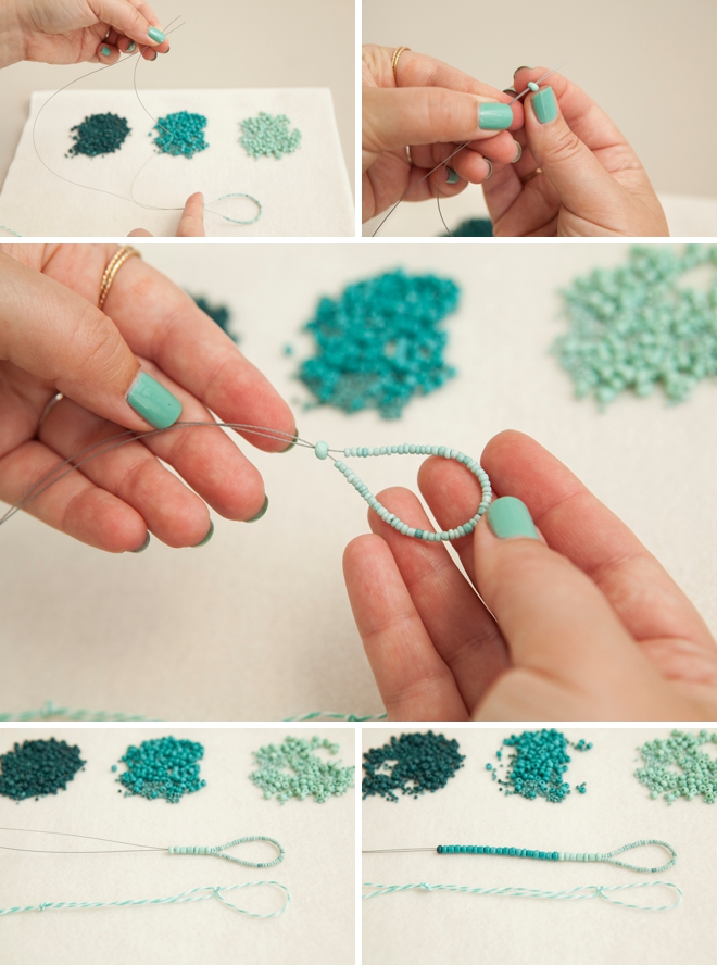 5. Теперь мы будем нанизывать бусинки отдельно на каждый конец проволоки. Добавьте по две бисеринки на каждый конец, а затем маленькие бусинки. Продолжайте добавлять маленькие бусинки, пока унизанный ними отрезок проволоки не достигнет длины, равной участку шпагата от второго узла до его конца.