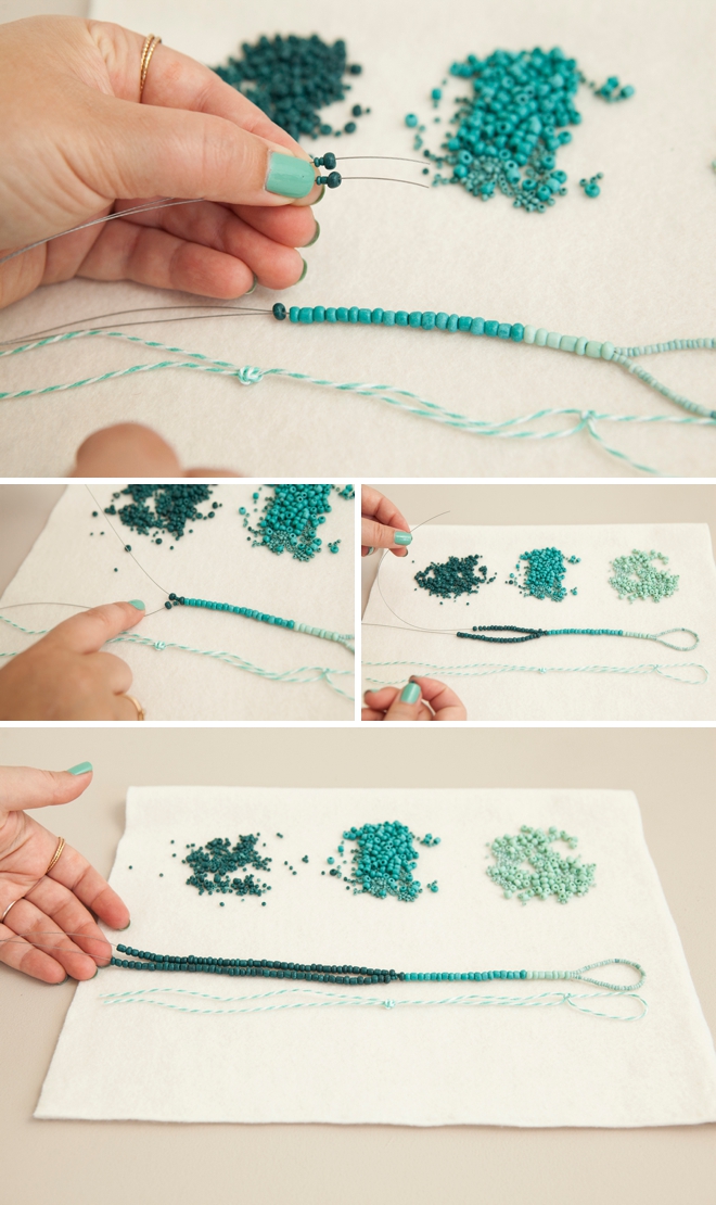 4. Для следующего участка бисероплетения согните проволоку пополам, а затем сложите ее концы вместе. Потом нанижите небольшую бусину (не бисер) на оба конца проволоки одновременно. Продолжайте нанизывать маленькие бусинки на сдвоенную проволоку, пока длина унизанного участка не достигнет второго узла на вашей мерке из шпагата.