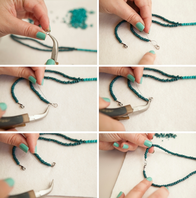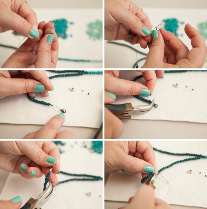 6. На один конец проволоки нанижите две обжимные бусины, а затем застежку. После того, как застежка будет вплетена, пропустите проволоку через две обжимные бусинки и натяните ее. Используя маленькие плоскогубцы, прижмите обжимные бусинки до плоского состояния, чтобы они закрепили конец проволоки.