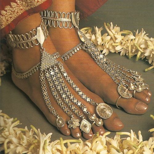 Яркие, обильно декорированные браслеты делают визуально короче слишком длинные ступни.