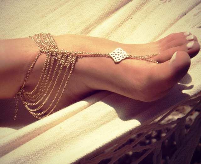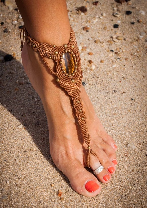 Барефуты лучше всего сочетаются с нарядами в этническом и бохо стиле. Будет очень колоритно, если в комплекте с ножными браслетами носить браслеты, ожерелья, серьги и кольца, выполненные в той же технике, стиле и из таких же материалов.