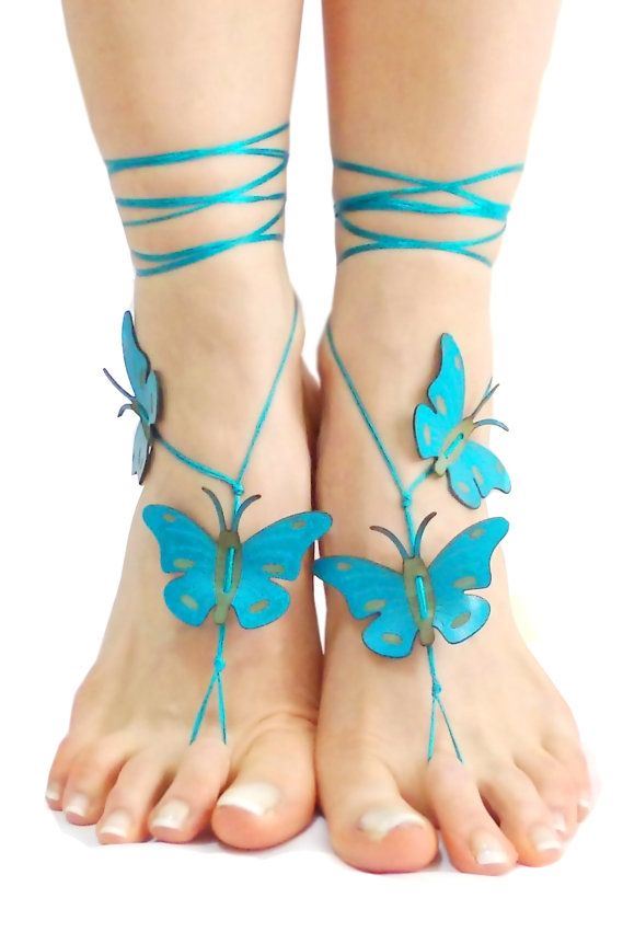 Это довольно необычная модель и подход для создания ножного браслета: довольно простая в исполнении и эффектная по внешнему виду. Здесь изготовленные из фоамирана бабочки просто нанизаны на шнуры, покрывающие ступню и оплетающие голень. Отличное дополнение, чтобы сделать романтичный наряд оригинальным.