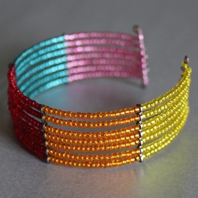 А так выглядит браслет из множества витков, унизанных разноцветной смесью крупного бисера: