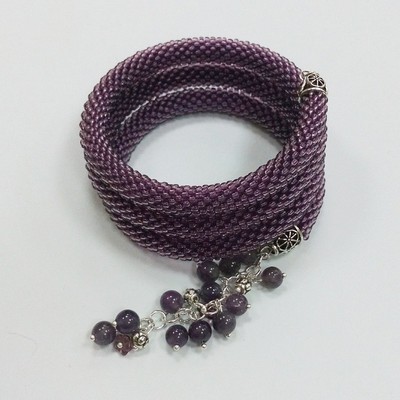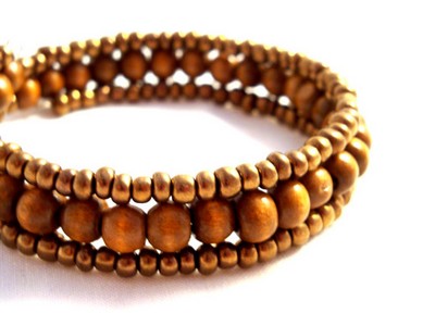Так выглядит изделие, в котором ряд из одинаковых крупных бусин расположен между двумя витками одинаковых бусинок поменьше, но в той же цветовой гамме.