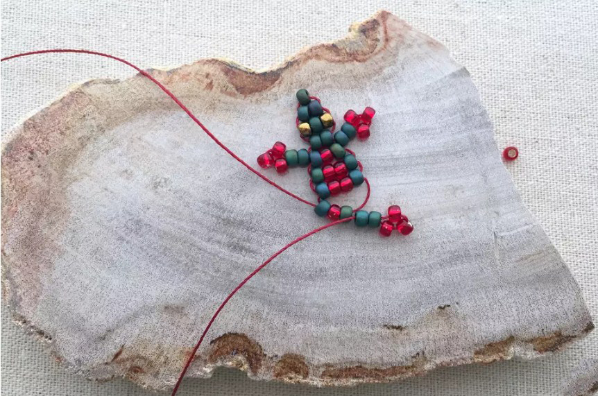 Пропустив последние из набранных три бисеринки, проденьте нить сквозь следующие две бисеринки. Натяните нитку так, чтобы бисерины плотно прижались и придвинулись к туловищу. Расставьте три бисеринки, составляющие лапу, в треугольник.