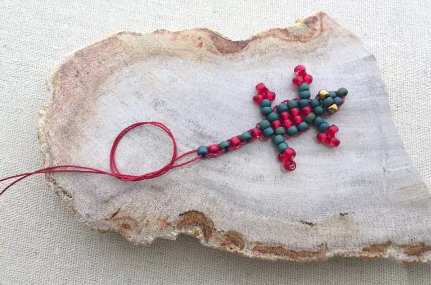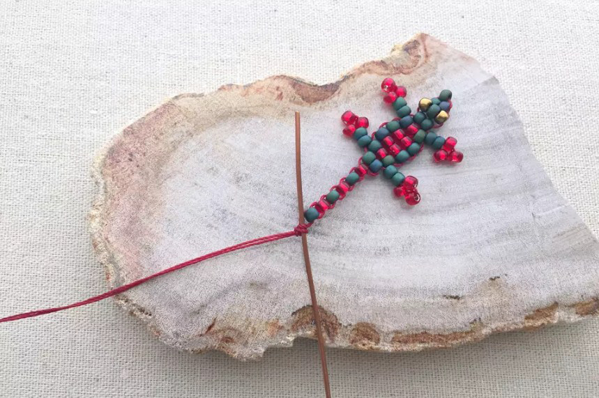 Нанизывайте по одной бисерине в ряду, чтобы сплести хвост крокодила. Когда закончите его, завяжите концы нитей на квадратный узел либо узел сверху. 9нам кажется, что предпочтительнее будет узел сверху, поскольку нам кажется, что он крепче держится.