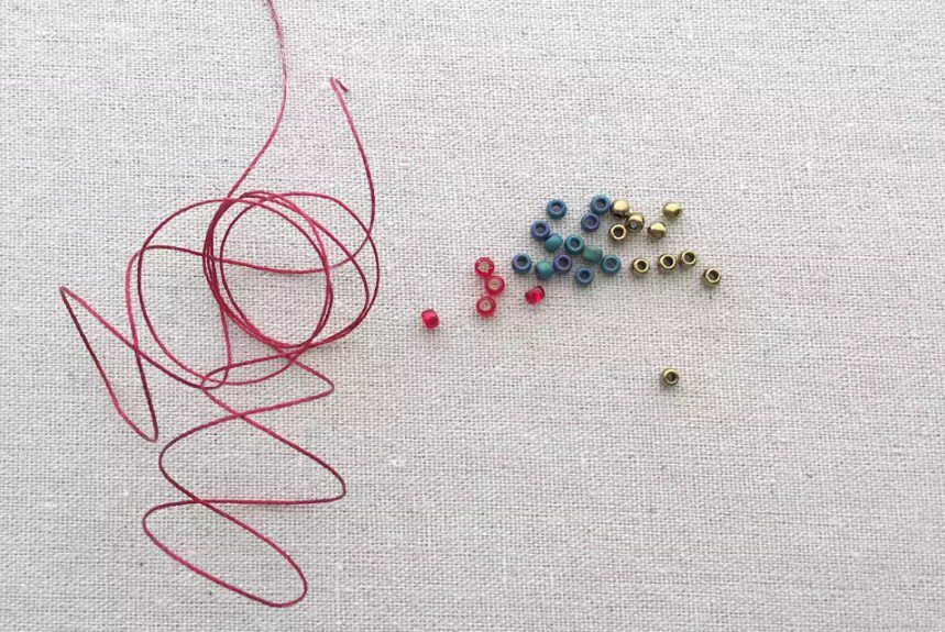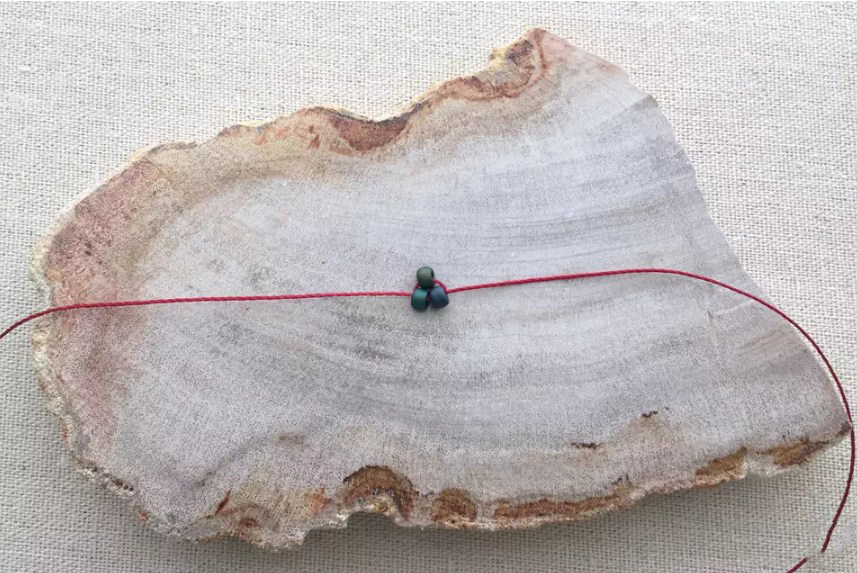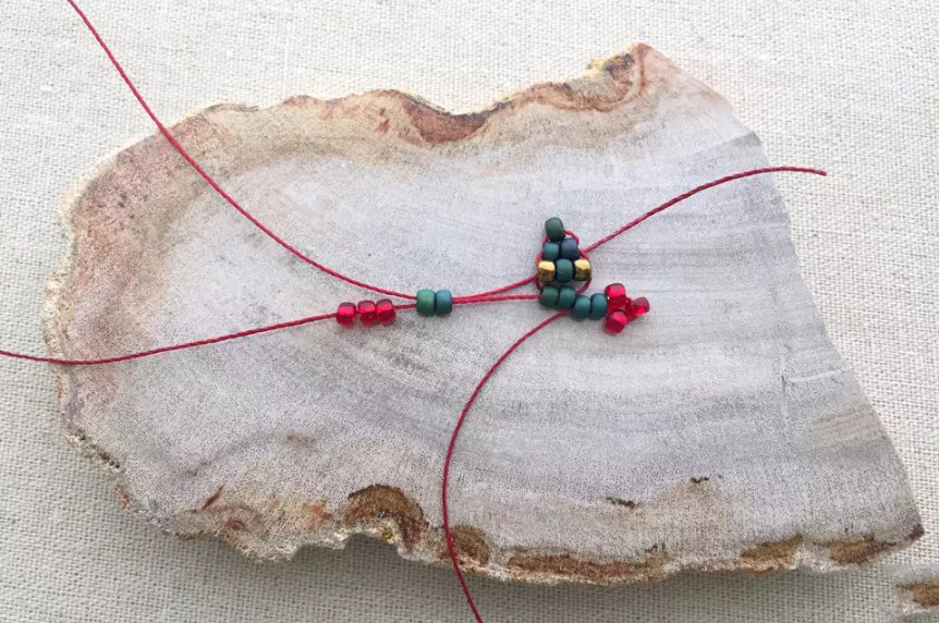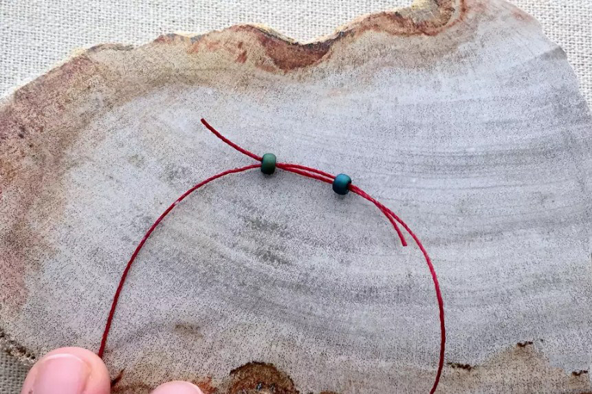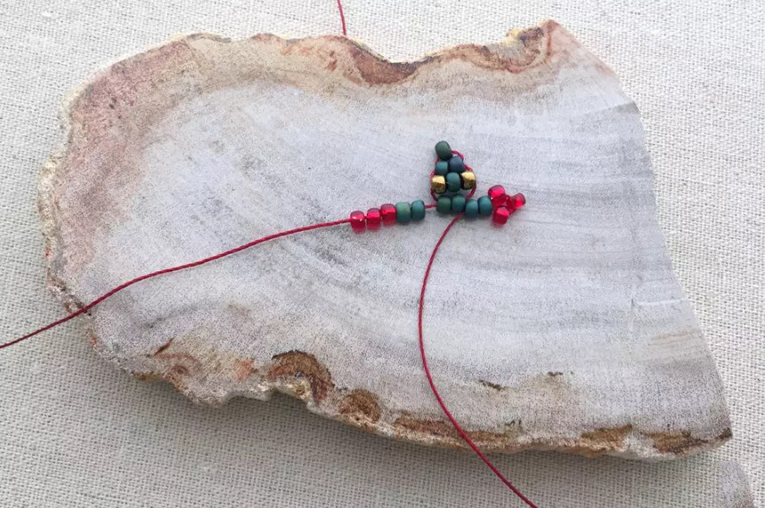 Добавьте еще две бусинки основного цвета (это будет второй ряд плетения) на один из концов нити. Удерживайте их на краю нити.