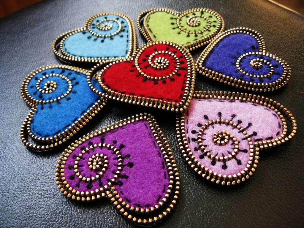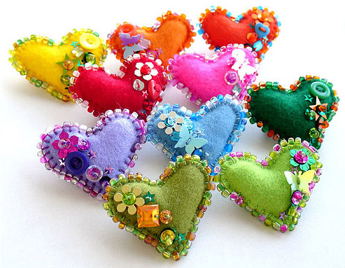8. Эти яркие сердечки, украшенные цветным бисером, пуговицами и блестками улучшают настроение при одном взгляде на них. Чудесный сувенир для родных и близких.