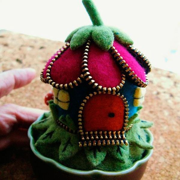 19. Очень оригинальная подушечка в форме цветочного домика. Фетр ярких цветов и отделка зубцами металлической молнии смотрится очень эффектно.