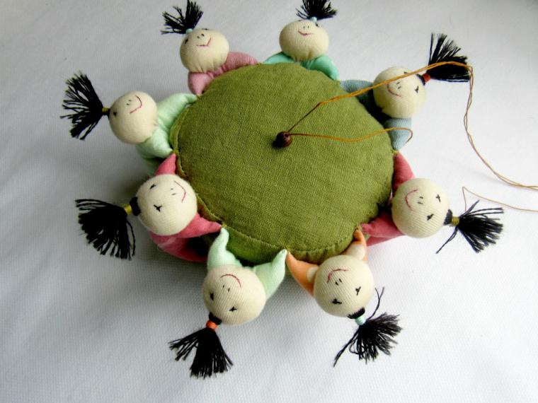 11. Для тех, кто хочет что-то затейливое: круглая подушечка-карусель, окруженная тканевыми куколками. Для создания этой модели придется повозиться немного дольше, но в результате получите вещицу с зарядом позитива.