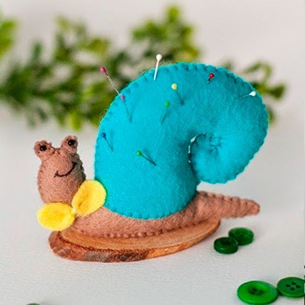 6. Игольница в виде улитки. Автор для устойчивости прикрепила аксессуар к деревянной подставке.