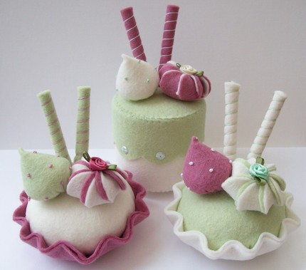 16. Кексы, зефиринки, мороженное навевают многообразие форм для подушек-игольниц. На фото они выполнены в нежных пастельных тонах и выглядят очень аппетитно.