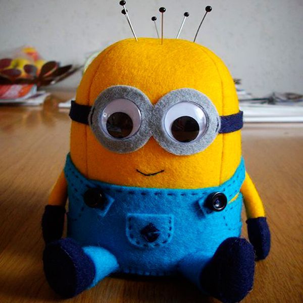 17. Форма многих героев мультфильмов тоже отлично подойдет для изготовления игольницы. Этого яркого веселого миньона трудно не заметить среди творческого беспорядка. Можно не сомневаться, что такой полезной игрушке будет рада любая юная рукодельница.