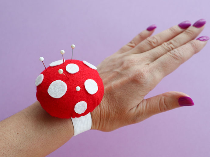 1. Обычные и самые простые виды игольниц – это подушечки разных форм. На фото – подушечка в виде гриба-мухомора. Но несколько усовершенствованная: она прикреплена к резиновому браслету. Такая модификация делает ее очень удобной для рукодельниц, которым приходится много и часто перемещаться вокруг создаваемого изделия, фиксируя в определенном положении ткань с помощью английских булавок. Такая игольница с необходимыми иголочками всегда будет с вами, не занимая места в руках.