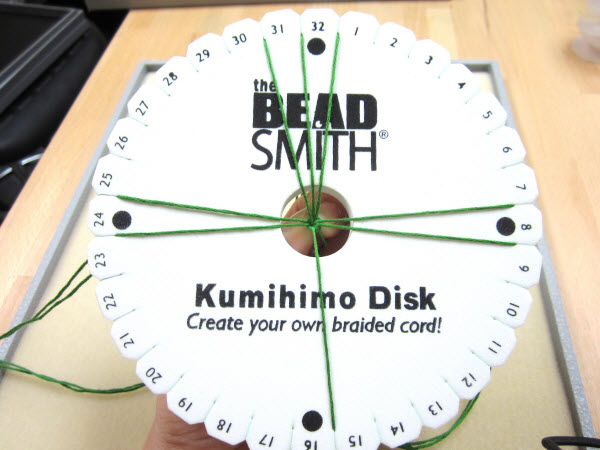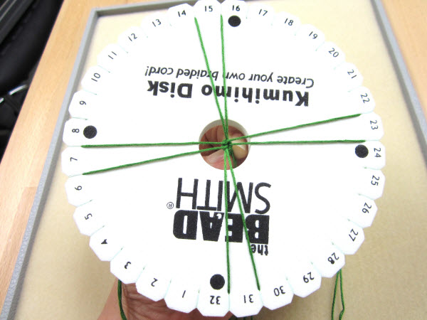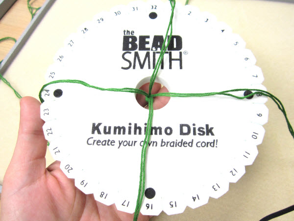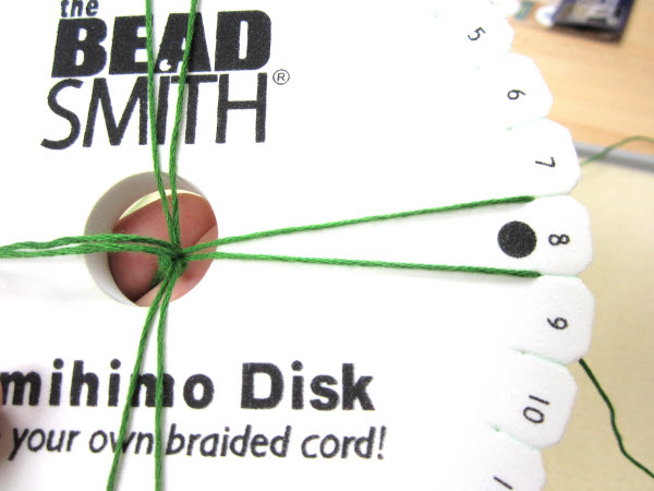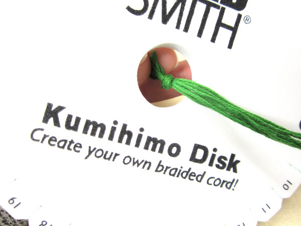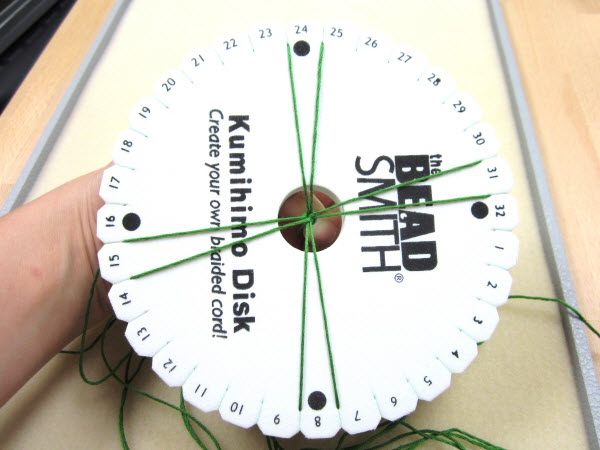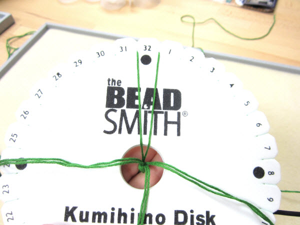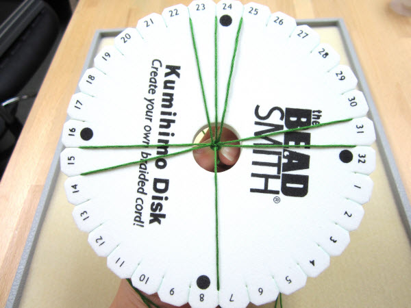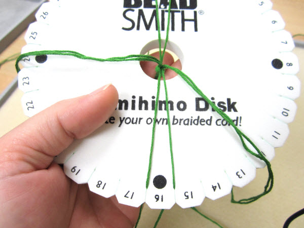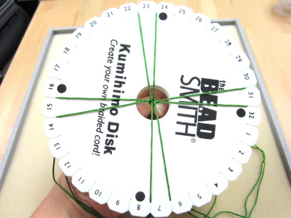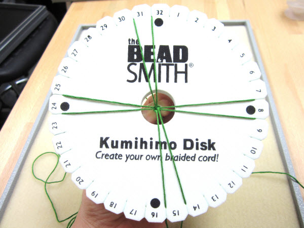 2. Опустите завязанный в узел конец в центральное отверстие на диске кумихимо.