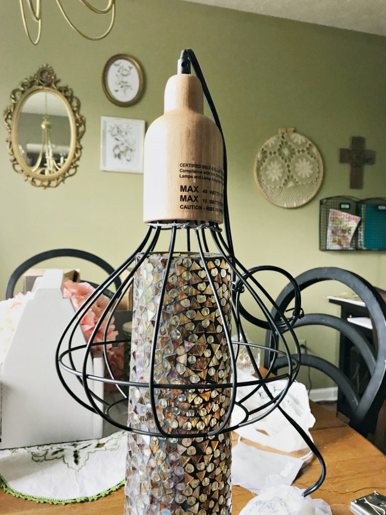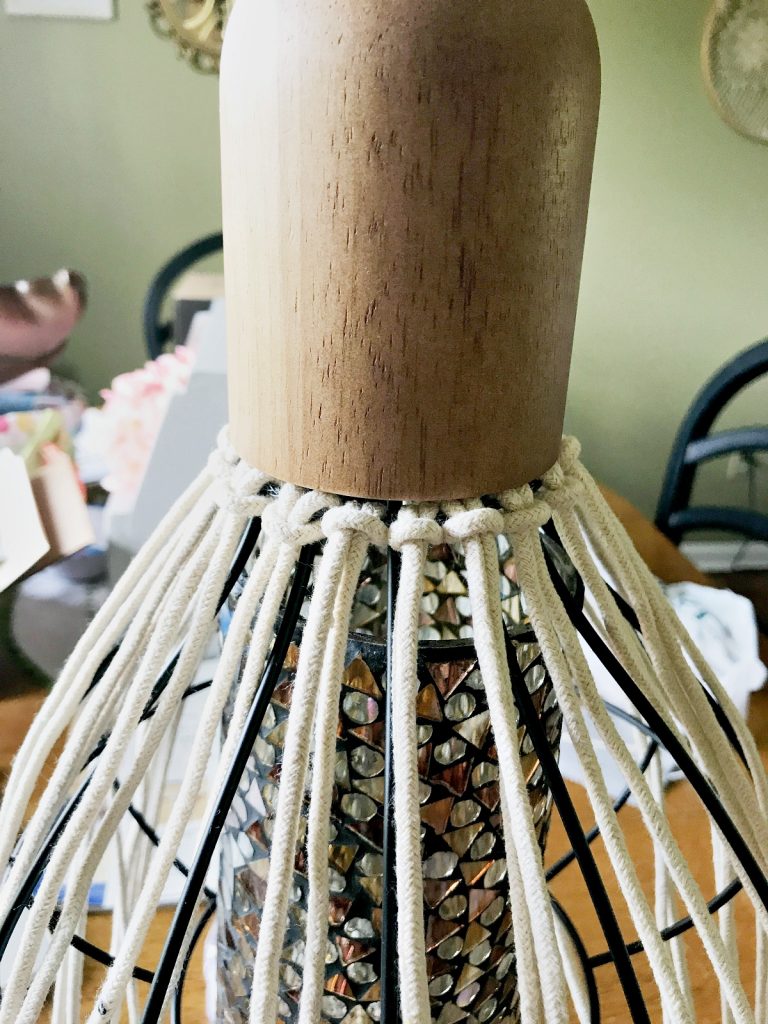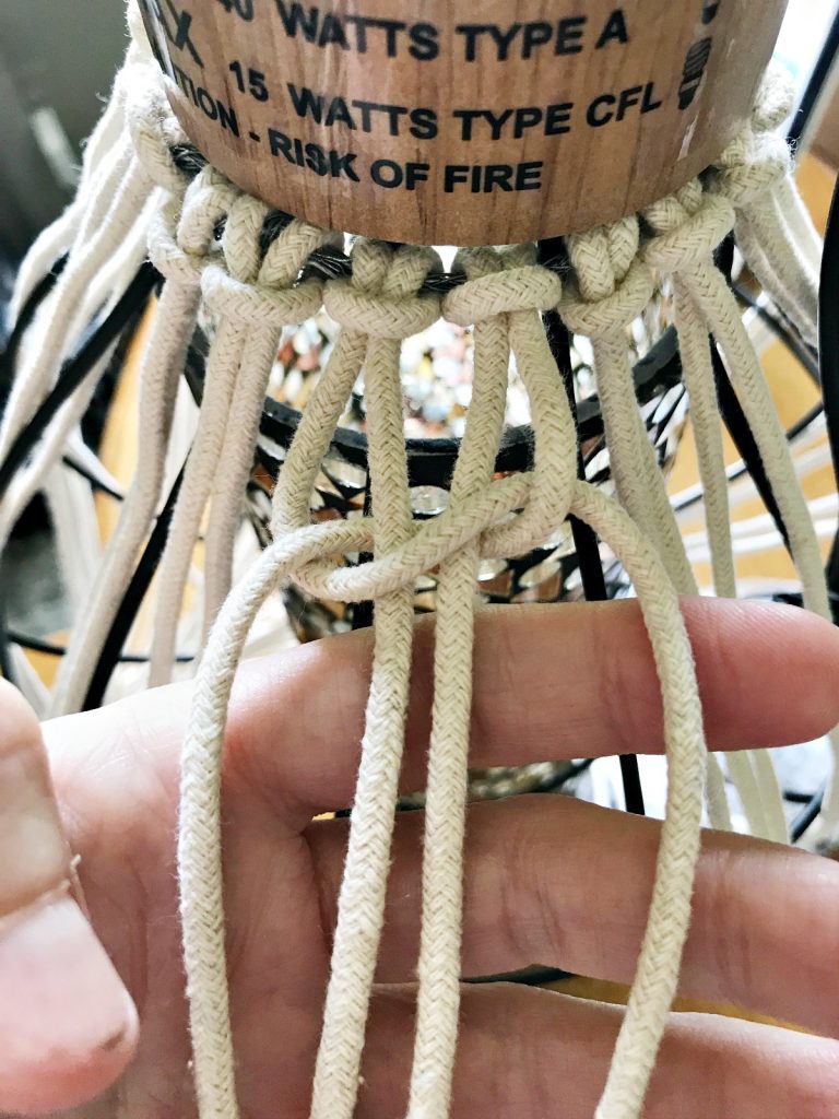 3. Измерьте высоту вашего светильника и разрежьте ваш шнур на отрезки длиной в 9 раз больше, чем высота светильника. Прикрепите получившиеся шнуры к металлическому каркасу.