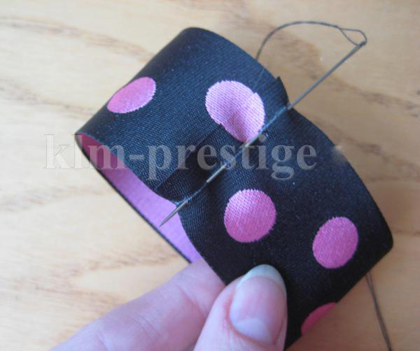 9. Проденьте бантик в петлю узелка на тонкой ленточке и сшейте все части вместе. Ваш бантик готов, можете прикрепить его к заколке, одежде или к другой вещи, которую собираетесь украсить.