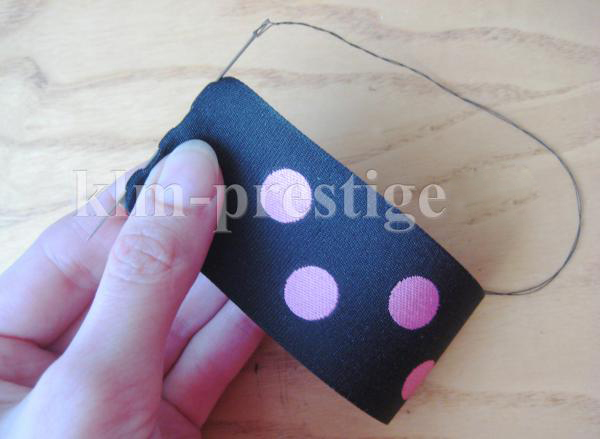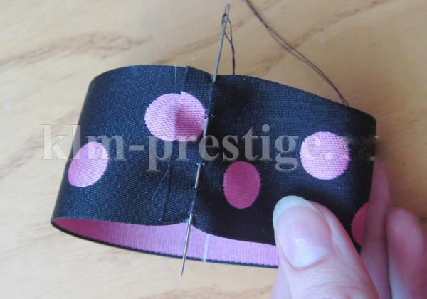 4. Таким же способом и этой же ниткой прошейте вторую ленту. Потом затяните нить и обкрутите ею прошитое место несколько раз, после чего закрепите нитку. Первая часть нашего банта готова.