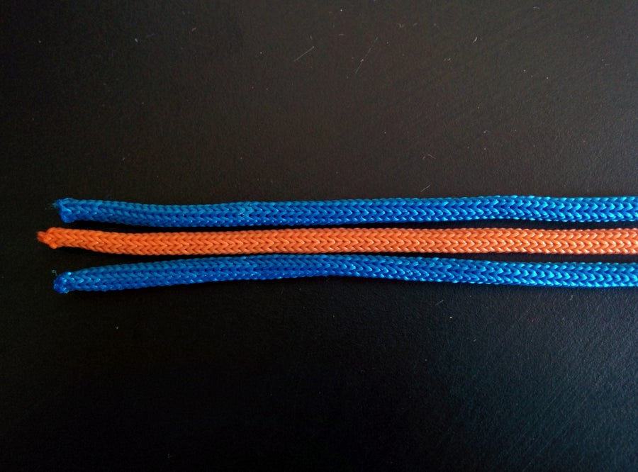 Расположите 3 шнура на плоской поверхности параллельно друг другу так, чтобы шнур другого цвета находился посередине между двумя одинаковыми, и подровняйте все их края.