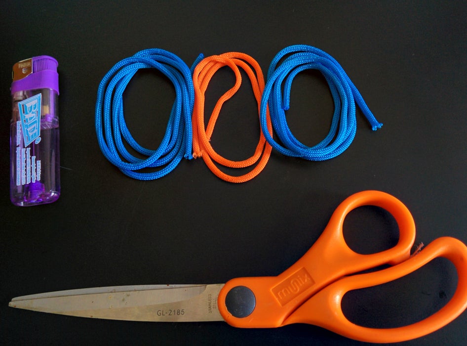 3 отрезка шнура длиной примерно 130 см каждый, два из которых должны быть одного цвета.