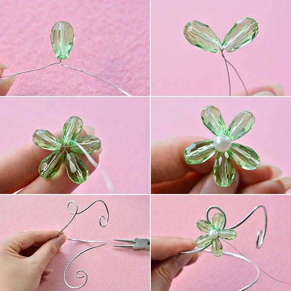 повторите добавление еще трех стеклянных бусинок-капель на этот же кусок проволоки, чтобы сделать остальные лепестки;