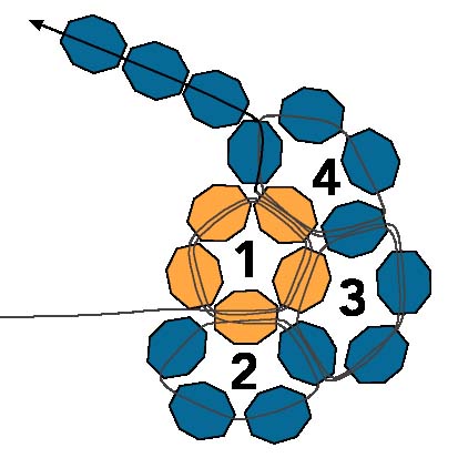 15. Протяните иглу через четвертую бисеринку из первой петли и обратно через первую из четвертой петли.