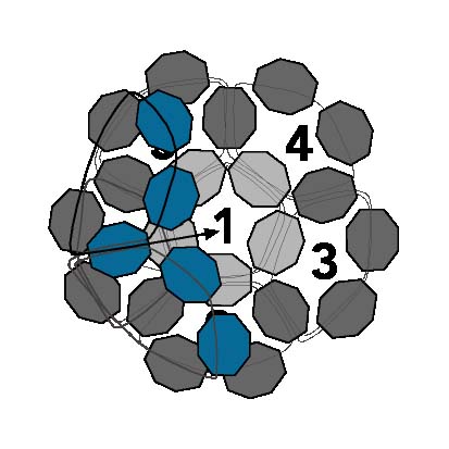 23. Первые шесть петель создают форму чашки с первой петлей внизу. Эти шесть петель показаны на схеме серым цветом и расположены за развивающимися рядами на диаграмме. Шесть петель создают первую половину круглого фуллерена, а следующие пять петель создадут вторую половину фуллерена, отклоняясь назад в противоположном направлении и образуя сферу.