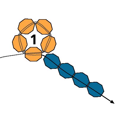 2. После этого протяните иглу через первую бисеринку, создавая круг из пяти бусинок (ориентируйтесь на схему).