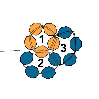 35. Пройдите через первую бисеринку, нанизанную на шаге 31, первую и последнюю бусинки шага 3 и третью из четвертого круга.