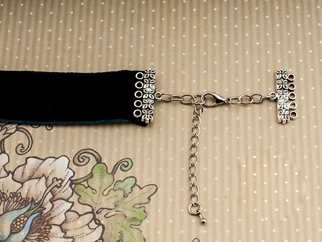 Прикрепите плоскогубцами кольца для крепления застежек к обжимам ленты, затем к кольцам присоедините застежку. Для большего удобства и регулировки размера, добавьте цепь-удлинитель на другой конец колье. Ваш чокер готов.