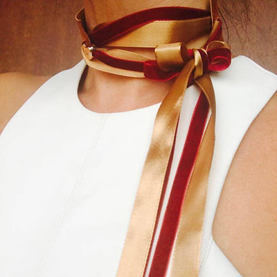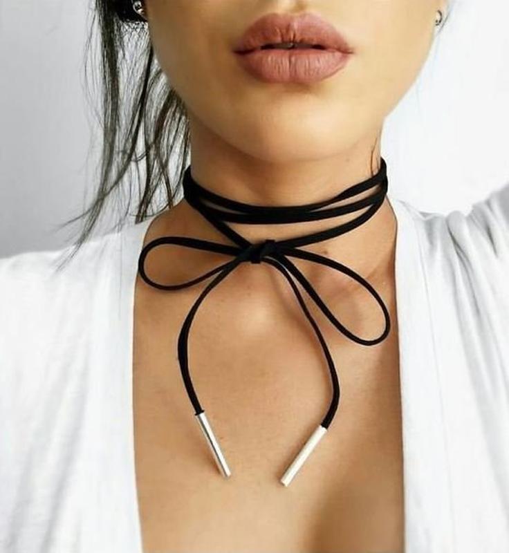 Весьма популярны в качестве чокеров длинные тонкие шнурки из кожи, которыми плотно обвязывают шею и завязывают на бантик со свисающими или нет кончиками.