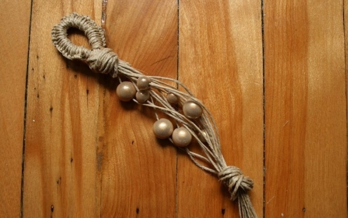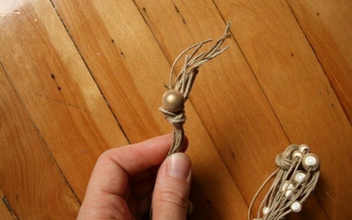 Поэкспериментируйте с чередованием шнуров с мелкими и средними бусинами и свободными шнурами, а также с размещением бусин по длине шнура для создания интересной комбинации. Сделайте отступление на шнурках – расстояние от оплетенной петли - размером около 10 см, после которого завяжите все шнуры из пучка в большой узел.