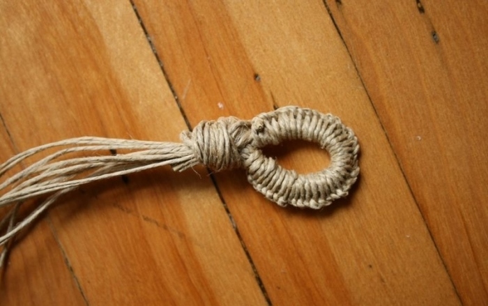 2. Возьмите седьмой отрезок шнура и начните им оплетать петлю на пучке.
