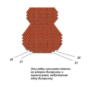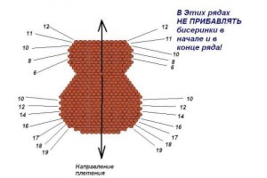 7. Помеченные строчки плетите с одной бисерины, не с двух. При завершении выполнения в этих строчках добавлять 1 бисеринку не надо. Обращайте внимание, чтобы число бисеринок в ваших строчках соответствовало схеме.
