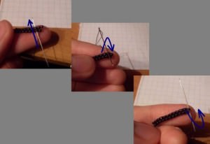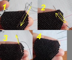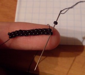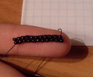 8. Потом направьте нитку в крайнюю бисеринку этой строчки, чтобы начать плести новый длинный ряд.