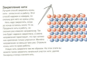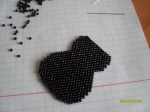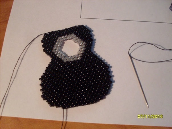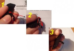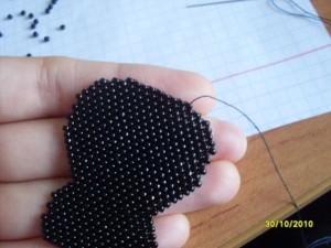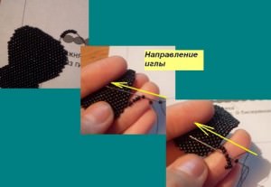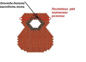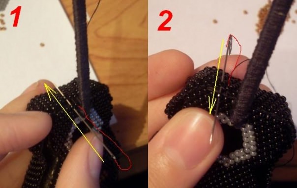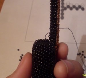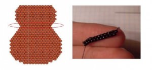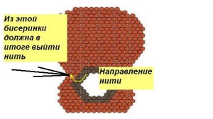 4. Доведя плетение до строчки, ранее помеченного на схеме, выходите иголкой из последней бисеринки от начала голосника. После этого сплетите его последнюю строчку.