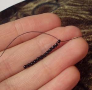 2. Затем проденьте иглу справа сквозь первую из добавленных бисеринок (слева-направо). Натяните нитку, и выровняйте ее края.