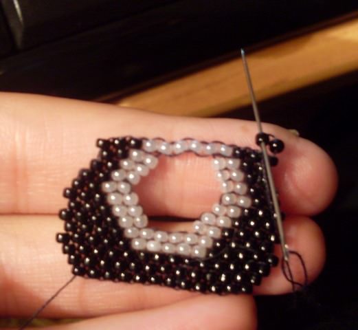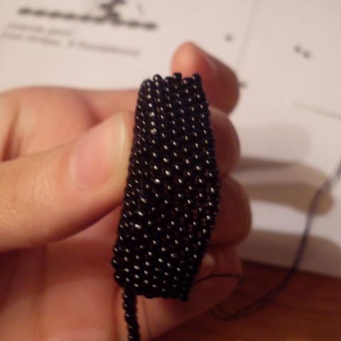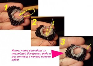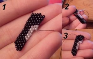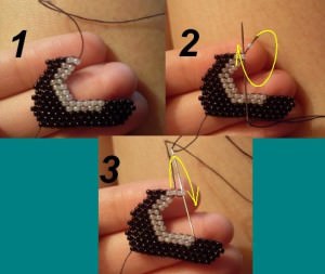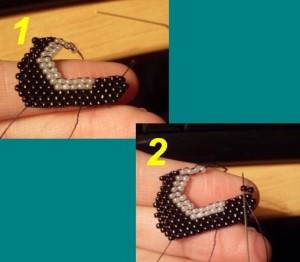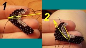 9. Посмотрите на фотографию, как выглядит плетение на данном этапе работы. Перенаправьте нить сразу во вторую бисеринку, а потом приплетайте ряд в соответствии со схемой. Таки образом у вас выйдет плоский край изделия.